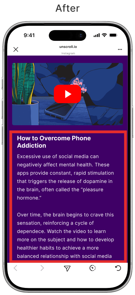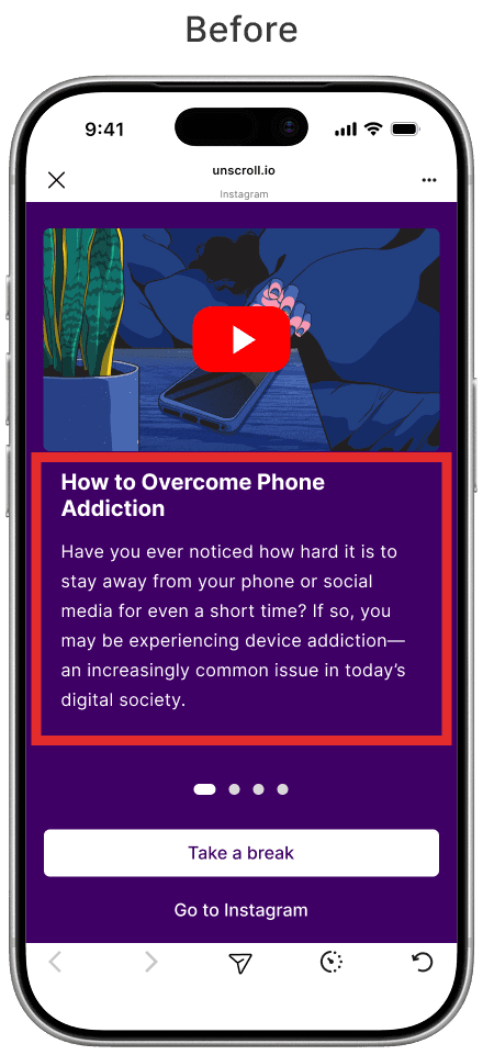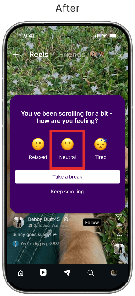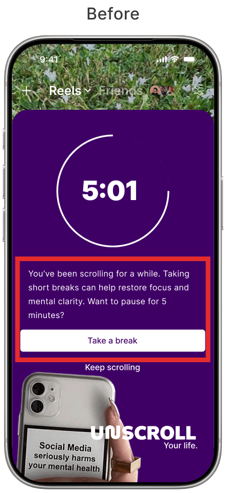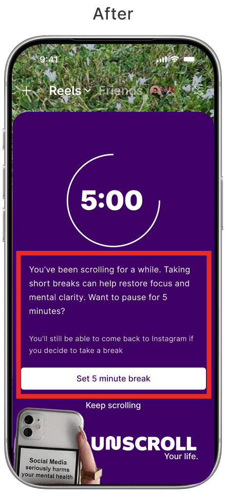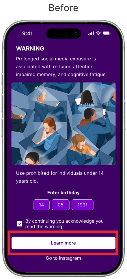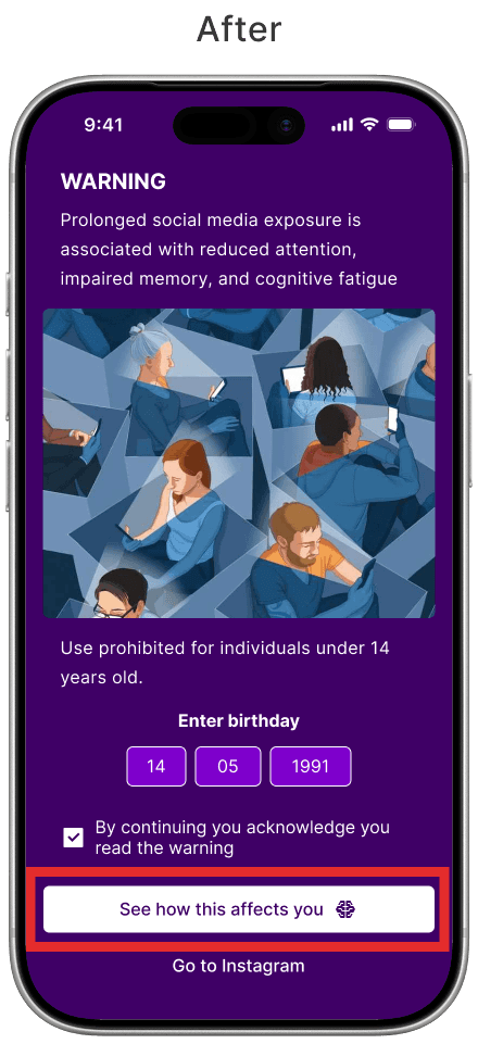 After testing revealed that the automatic countdown caused confusion regarding potential restrictions on Instagram, we redesigned the interaction. We replaced the automatic trigger with a manual one, where the timer only begins with the user's consent. Additionally, we refined the copy to clarify that navigation remains unrestricted, effectively eliminating any punitive sensation.